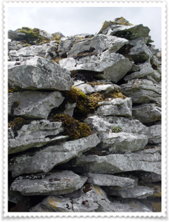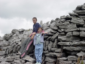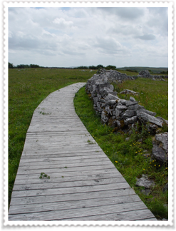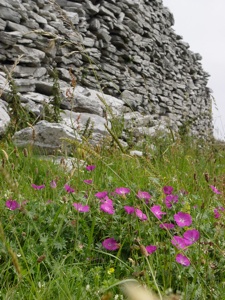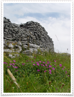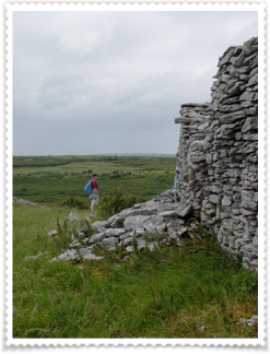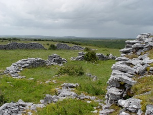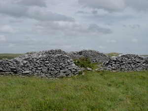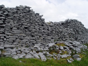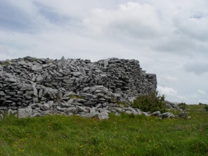 Cahercommaun sits on the edge of an inland cliff facing north overlooking a wooded valley, with three concentric walls reaching to the cliff edge. The inner wall alone used 16,500 tons of stone. The outer wall measures some 350 ft east-west by 245ft north-south. The inner wall is about 5ft thick and 4ft high and rises 12 to 14 feet above the cliff. The innermost wall, which is the thickest, forms an almost complete circle, but the two outer walls (connected with each other by subsidiary walls, like a fan) only form a semicircle. The innermost wall contains three chambers within the wall.