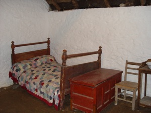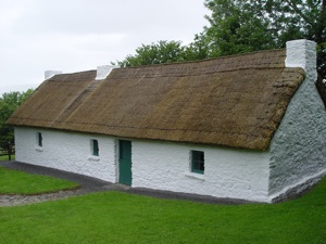 The cottage nestles in the shade of Kaedeen mountain at the top of a grassy lane off the Donard to Rathdangan road in Co. Wicklow. It is a fine example of a traditional thatched cottage built with local stone and whitewashed inside and out. It was from this cottage, in the winter of 1799, that the famed rebel, Michael Dwyer, fought the encircling British troops and finally made good his escape over the snow covered mountains. The cottage was later destroyed by fire and lay in ruins for almost 150 years. It was restored to its original form as a monument in the late 1940s and again extensively repaired and re-roofed in 1992.